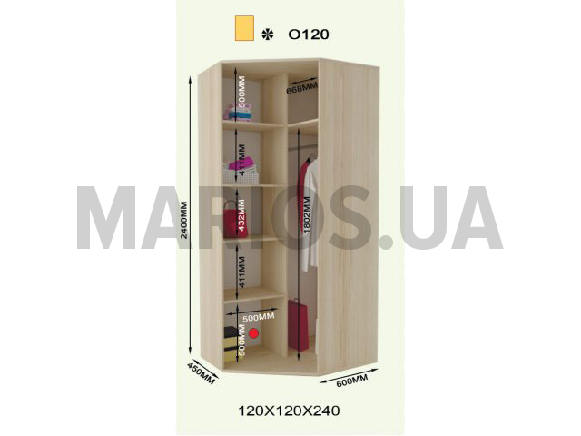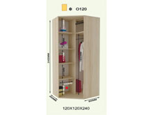 120.00см x 120.00см x 240.00см Характеристики шкафа Количество дверей1 дверь Материал корпусаДСП 16мм, кромка ПВХ 0,5 и 2мм Оснащение6 полок, штанга для тремпелей, одна двери (ДСП или зеркало) Форма шкафаугловой Угловой шкаф О-120.В комплектацию шкафа входит: 6 полок, отделение для тремпелей с металлической штангой и одна дверь с профилем Элит в цвете серебро. Дверь шкафа может быть выполнена из ДСП, зеркальная, комбинированная или же с горизонтальным делениям. Размеры шкафа: глубина/ширина/высота - 120/120/240. Возможно выполнение шкафов высотой 250см за дополнительную плату. Материалы, из которых изготовлен угловой шкаф О-120: Корпус: ДСП 16мм; Фасады: зеркальные и панельные; Кромка: ПВХ 0.5 и 2мм; Зеркало: 4 мм; Штанга: металлическая. Профиль: Элит или Квадратный. Цвет: серебро, золото светлое, бронза светлая, венге глянец. Раздвижная система: алюминиевая.
