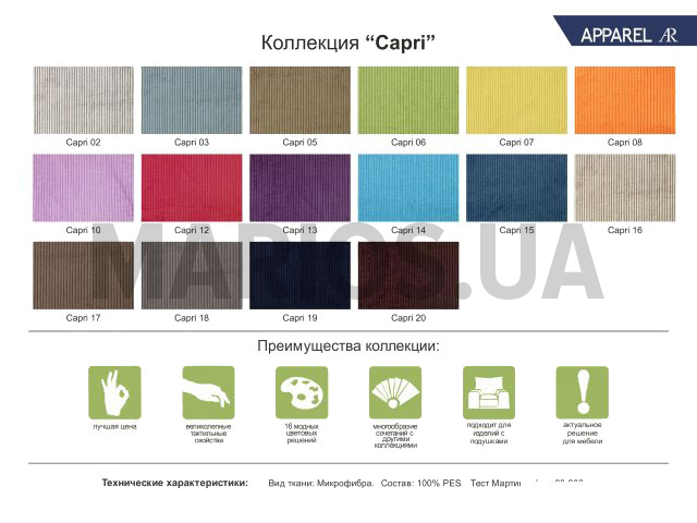 Основные преимущества ткани Вельвет Capri 07: удобная в эксплуатации; демократичная цена; используется при изготовлении диванов различных форм и для любого интерьера.